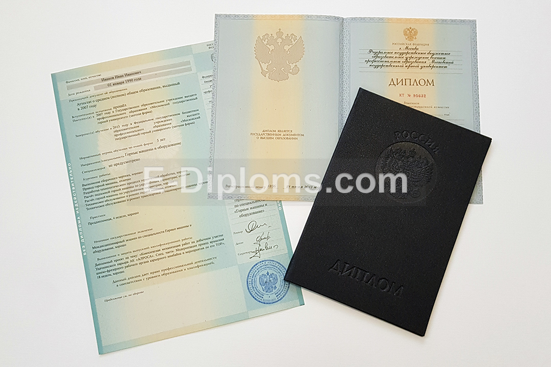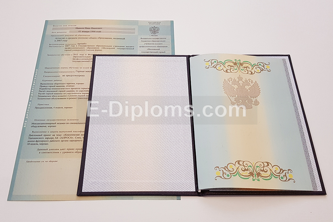 Диплом изготавливается на таких же бланках, которые выдавались выпускникам ВУЗов России в 2012, 2013 годах. Учебная программа, курсовые, ВКР соответствуют выбранному направлению подготовки и выбранному университету; гербовая печать и подписи, как в оригинале.